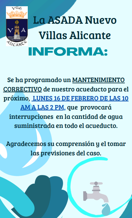 La ASADA Villas de Alicante es una acueducto de mucha importancia dentro del entorno donde habitamos. El agua es un recurso que si no lo cuidamos podemos, en pocos años, perderlo.